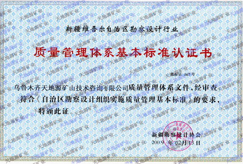 新疆天地源地勘公司成立于2004年,歷經十余年的發(fā)展,現持有地質勘查甲級資質和ISO9001:2008質量管理體系認證證書。